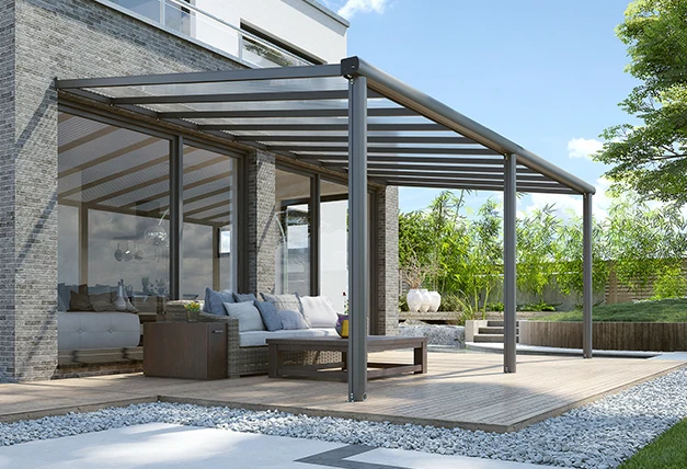Découvrez la liberté avec une touche de robustesse. Profitez d’une sensation d’espace et d’ouverture, tout en bénéficiant d’une vue dégagée. La Giallo Plus vous offre tout cela. Grâce à sa gouttière renforcée, elle permet une plus grande largeur, avec une toiture en verre allant jusqu’à sept mètres, et cela avec seulement deux poteaux. Une solution unique et élégante pour chaque jardin.